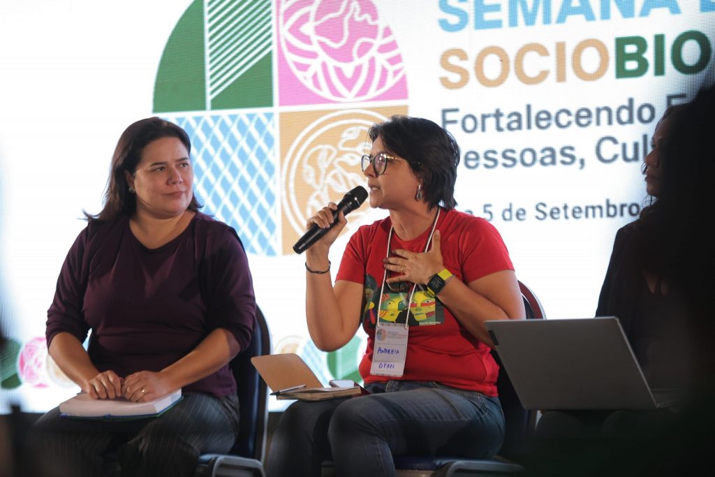 O tema da COP 30 encerrou a programação de debates da Semana da Sociobiodiversidade. A mesa, composta por Andreia Fanzeres (Operação Amazônia Nativa – OPAN), Angela Mendes (Comitê Chico Mendes) e Luciana Abade (Presidência da COP), trouxe reflexões sobre a Conferência do Clima que será realizada em novembro, em Belém (PA).