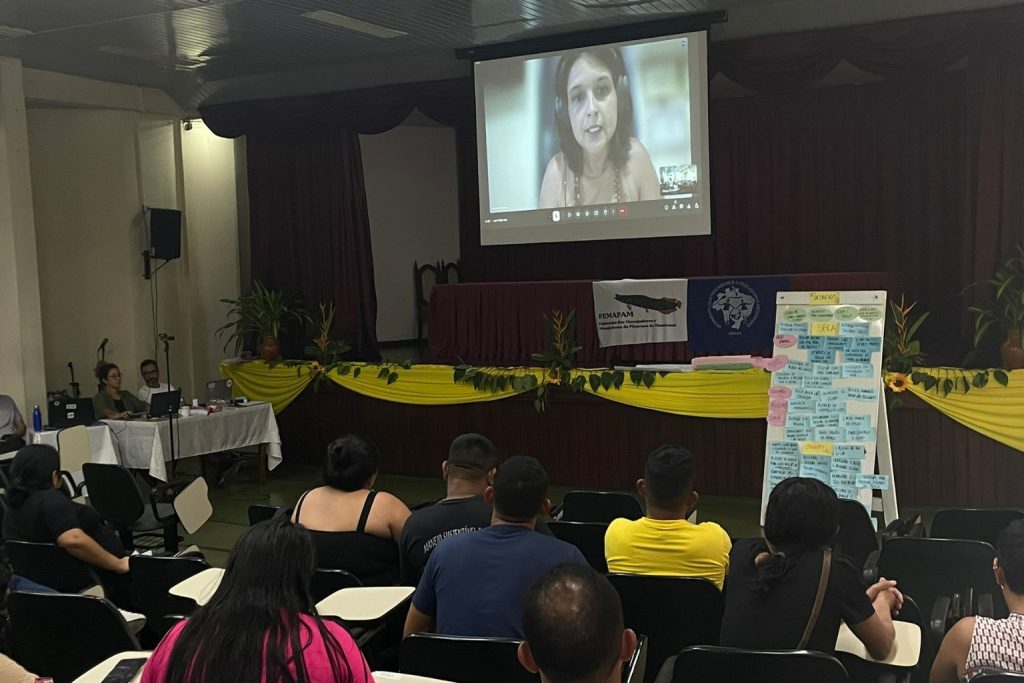 Pela primeira vez o Coletivo do Pirarucu discute sua possível participação em uma conferência do clima. Durante o encontro, Andreia Fanzeres, coordenadora do Programa de Direitos Indígenas, Política Indigenista e Informação à Sociedade (PDI) da Operação Amazônia Nativa (OPAN), apresentou o cenário das políticas climáticas e destacou oportunidades de participação na COP 30.