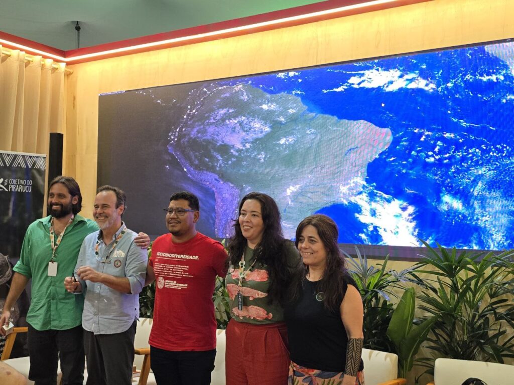 Na sociobioeconomia, produção e conservação andam juntas. A palavra é nova, mas a história remonta a um período de oito mil anos de sistemas agrícolas à qual se conecta o manejo sustentável de pirarucu. Durante o evento “Arapaima gigas: Clima e Soluções Comunitárias”, realizado no Círculo dos Povos, na Zona Verde da COP30, dia 13 de novembro, a sociobioconomia foi colocada no centro do debate por sua eficácia para a proteção da floresta e o enfrentamento da crise climática a partir do trabalho comunitário realizado com o manejo de pirarucu.