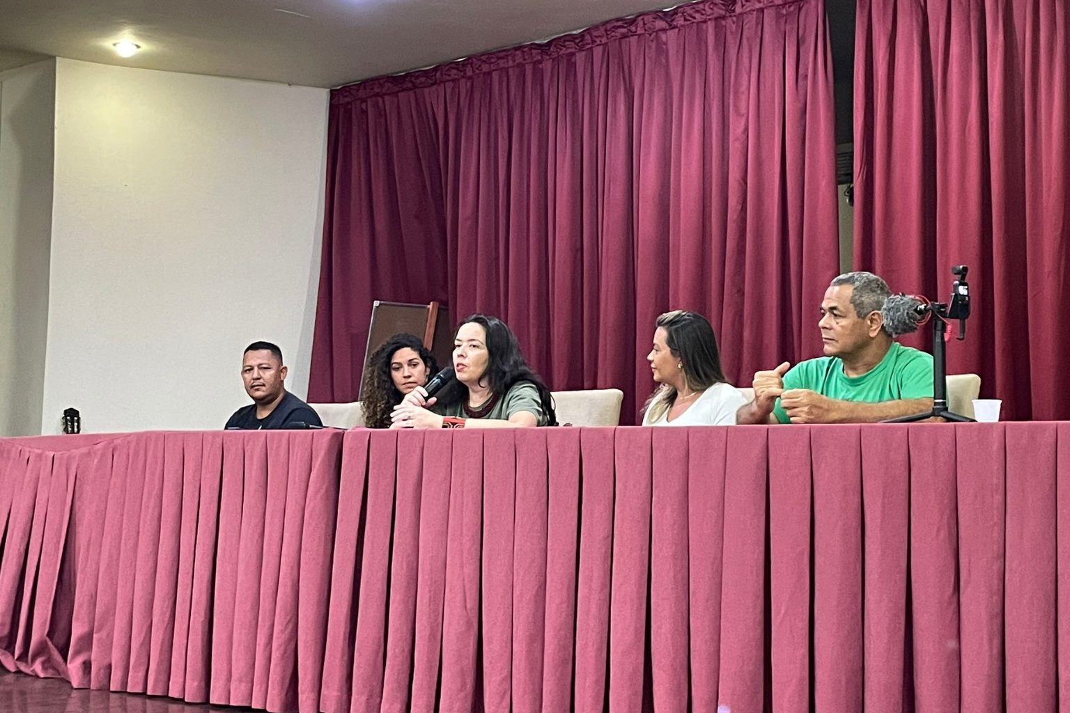 Mesa de abertura da audiência pública, com representantes do MMA, MAPA, MPA, Coletivo do Pirarucu e Rede Maniva de Agroecologia do Amazonas (REMA). Foto: Talita Oliveira/OPAN